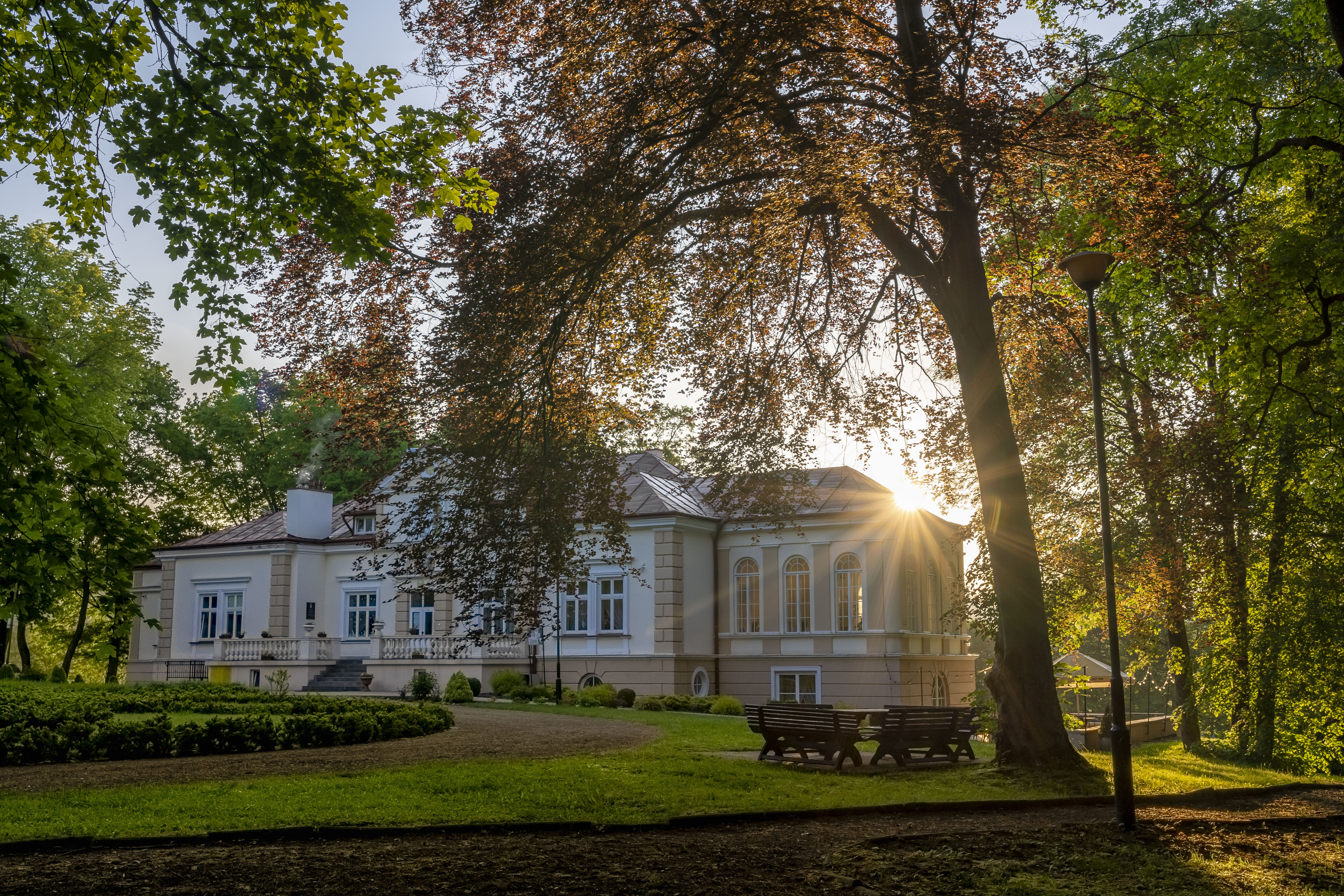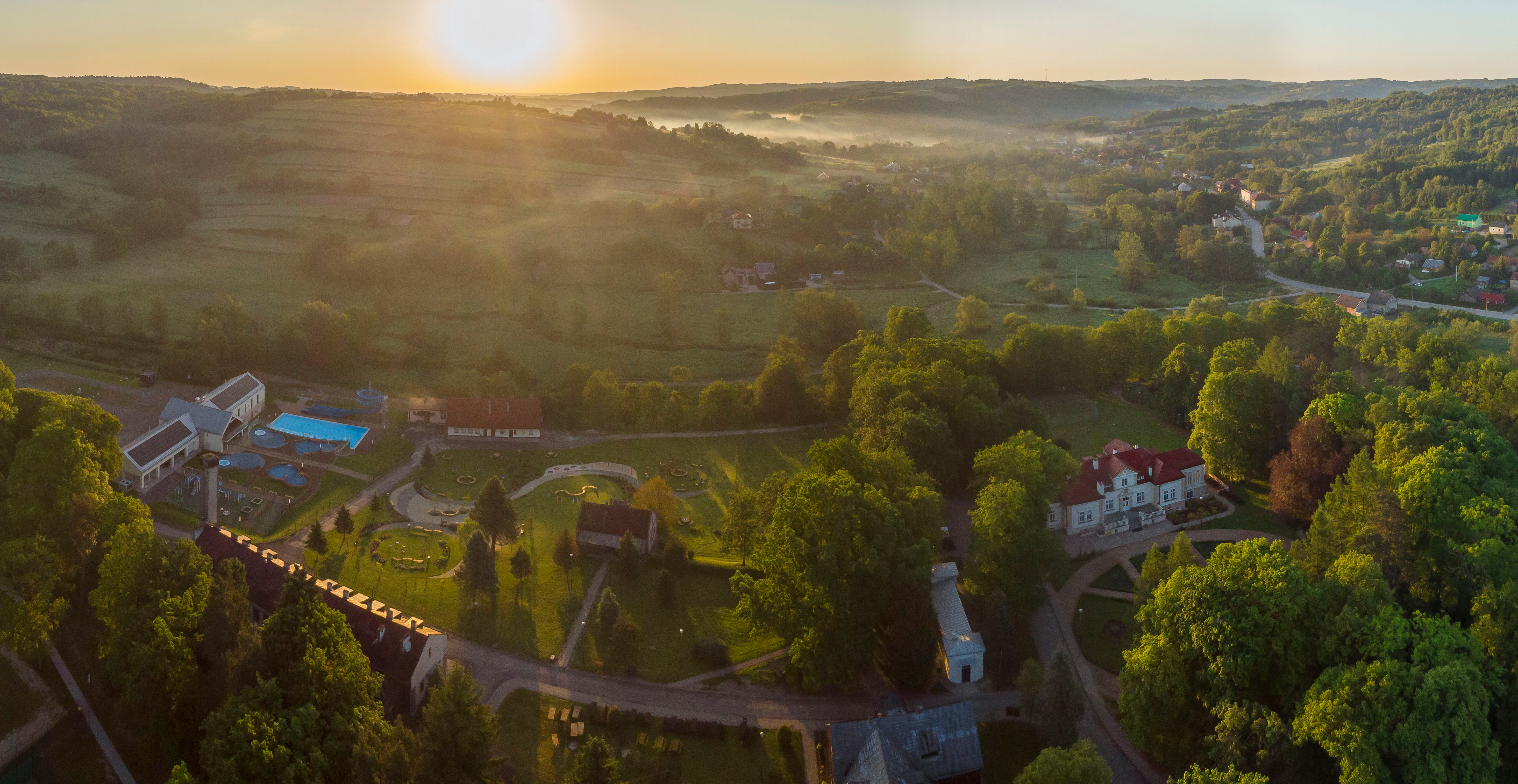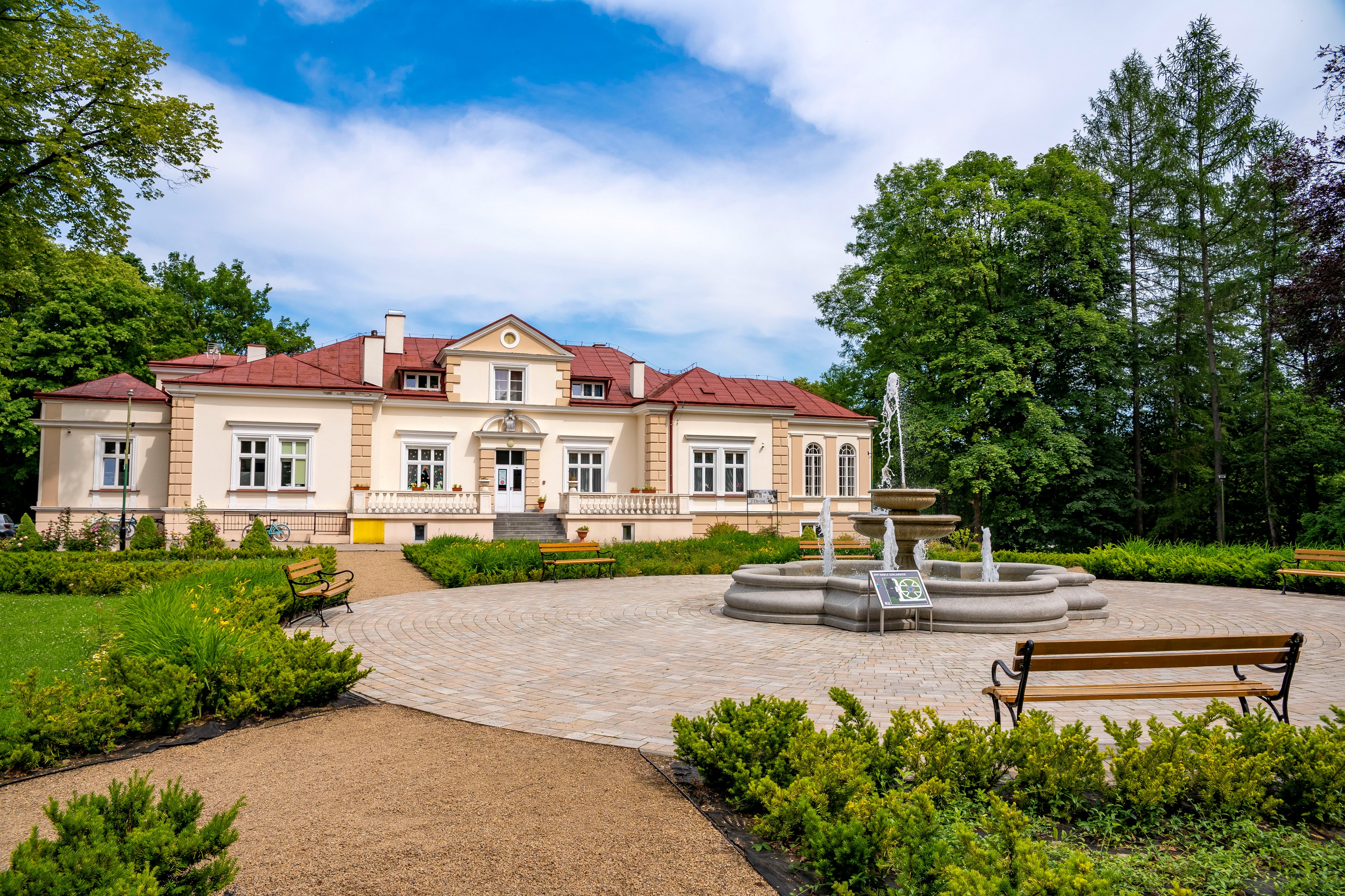 Zespół pałacowo-parkowy z przełomu XIX i XX w. w skład, którego wchodzą: parterowy, murowany dwór z tarasem wybudowany przez Piotra i Wandę Łastowieckich herbu Laryssa w otoczeniu parku krajobrazowego wraz z pomnikowymi dębami, dwór modrzewiowy określany jako stary dwór, budynek oranżerii, budynek gospodarczy z którego zachował się budynek kuźni oraz stajnia. Oprócz nich znajdują się tutaj współczesne budynki rekreacyjno-sportowe - kompleks basenów z placem zabaw. W otoczeniu dworu znajduje się park w typie krajobrazowym do którego prowadzą dwie bramy. Główny wjazd prowadzi od strony wsi przez ozdobną bramę wiodącą przez mostek nad potokiem, a drugi usytuowany jest po przeciwnej stronie i doprowadza do części gospodarczej. Obecnie po remontach zespół pełni funkcje hotelowo-restauracyjne, wypoczynkowe i sportowo-rekreacyjne.