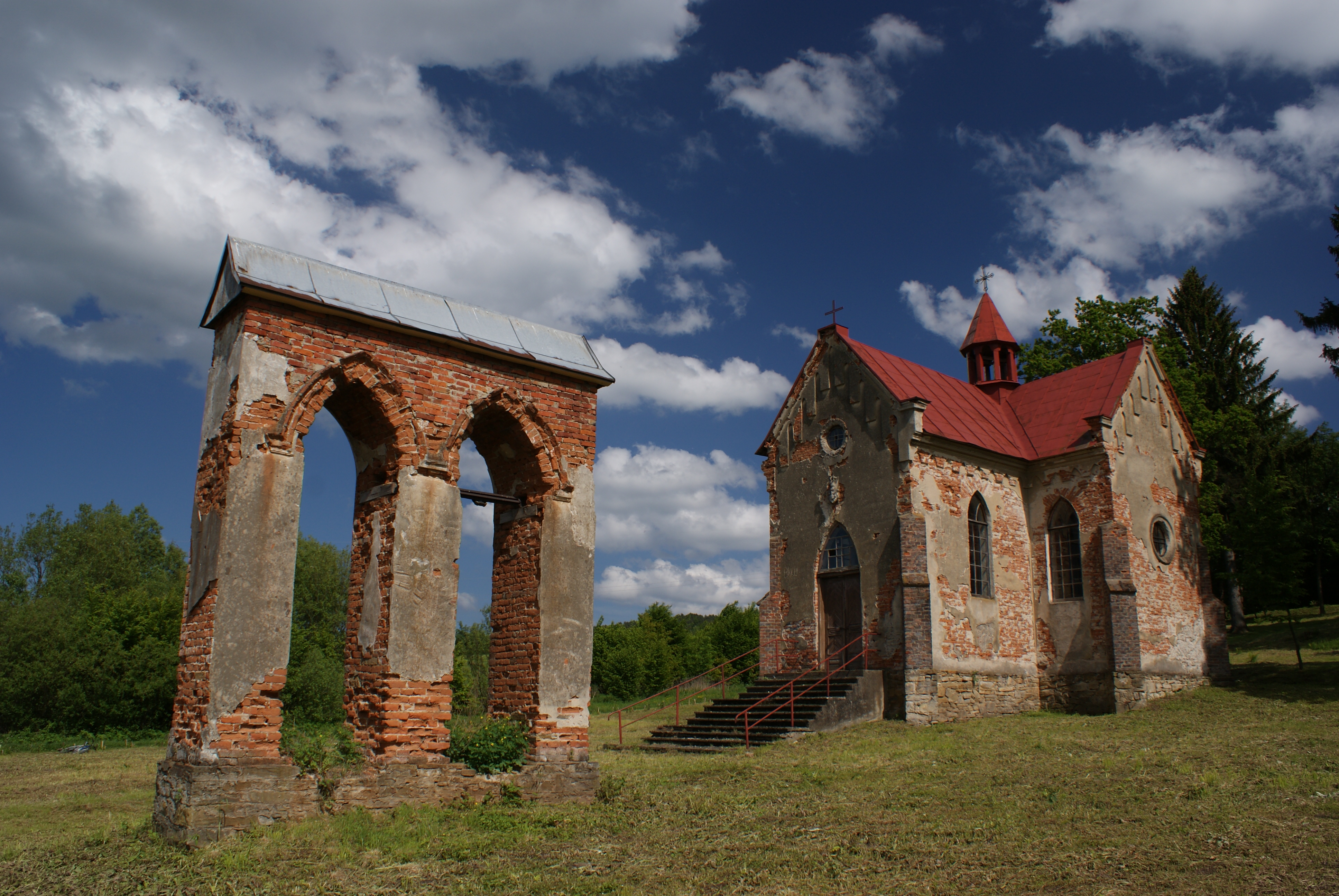 Murowany neogotycki kościół, a właściwie kaplica grobowa Trzcińskich, ostatnich właścicieli ziemskich. Obok parawanowa dzwonnica bez dzwonów.